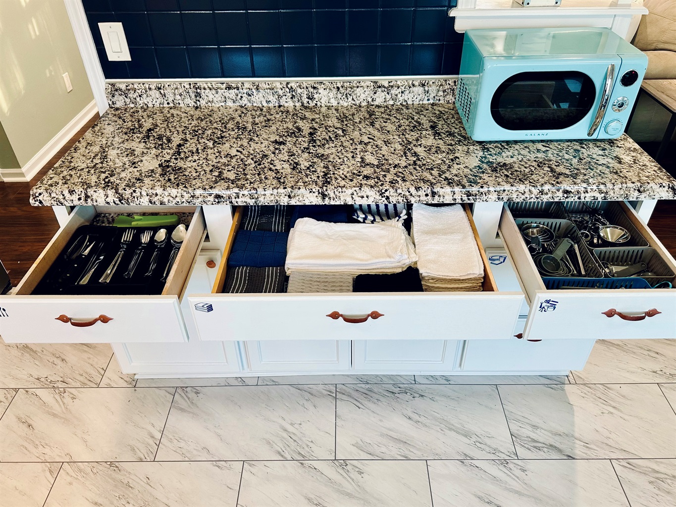 The main living area is arranged for real-life comfort, with seating that’s comfortable for both relaxing evenings and casual gatherings. The kitchen is fully stocked and set up for everyday cooking, with full-size appliances, cookware, dishes, and storage—ideal for guests who prefer preparing meals at home during longer stays.